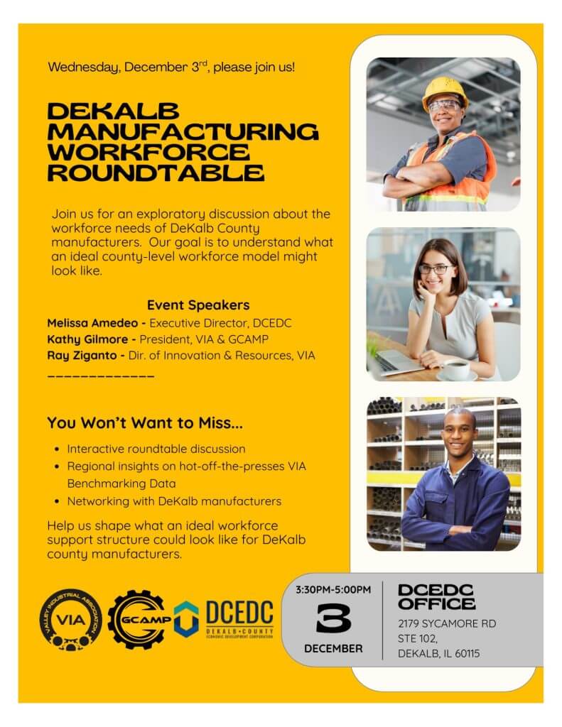 The DeKalb County Economic Development Corporation and Valley Industrial Association invite you to FREE a Manufacturing Workforce Roundtable on Tuesday, December 3, from 3:30–5:00 PM.