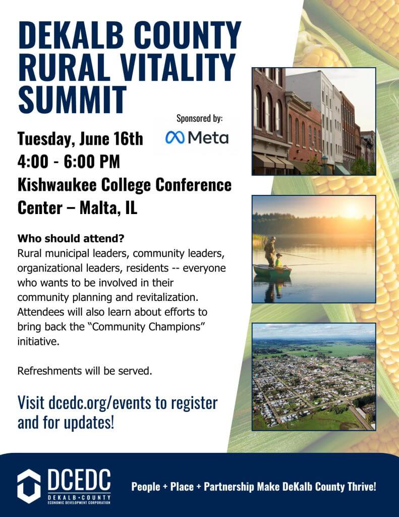 Join us on Tuesday, June 16th from 4:00 – 6:00 PM at the Kishwaukee College Conference Center for the DeKalb County Rural Vitality Summit! No cost, but please RSVP by June 9!